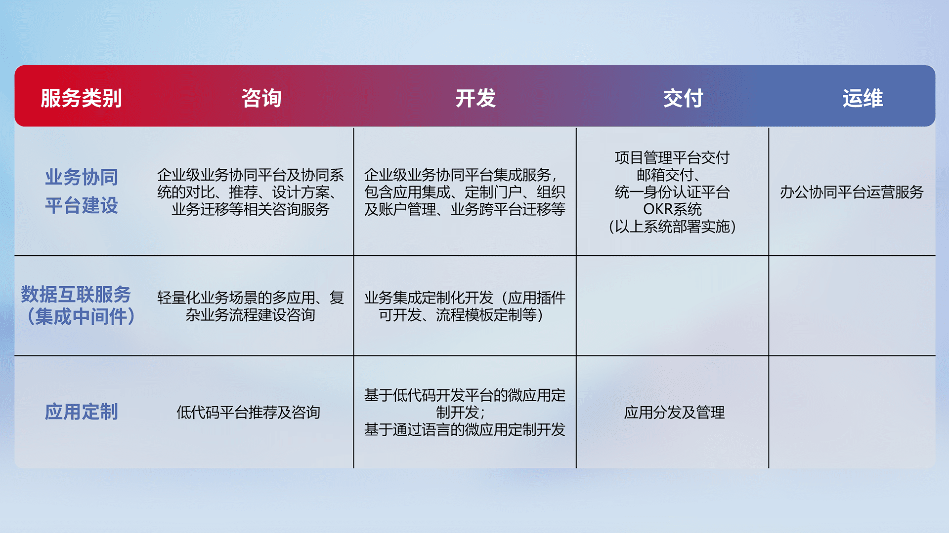 针对钉钉、、、、企微、、IDaas等平台级产品提供产品的规划、、、、方案、、、交付、、、定制化开发等服务,,,实现如统一协同办公、、智能客户服务、、、混合会议管理、、、、智能数据查询、、、、等业务场景,,实现数字化转型。。